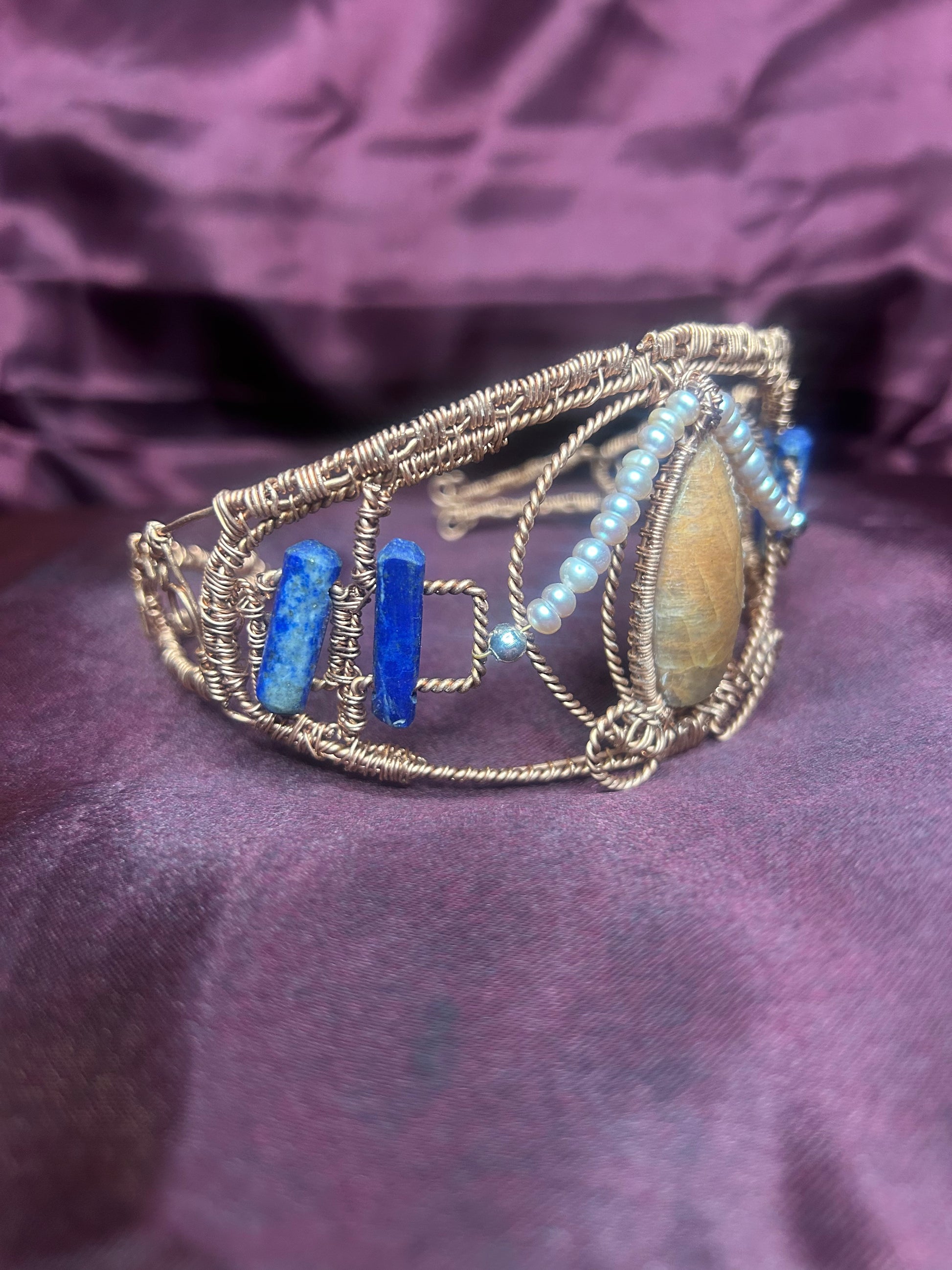 A regal masterpiece meticulously wrapped in copper wire, the Celestial Serenity Crown unites three powerful gemstones in harmonious elegance. Luminous Peach Moonstone radiates divine feminine energy and emotional balance, while deep Lapis Lazuli awakens inner wisdom and spiritual insight. Lustrous Pearl accents add a touch of timeless sophistication and purity.